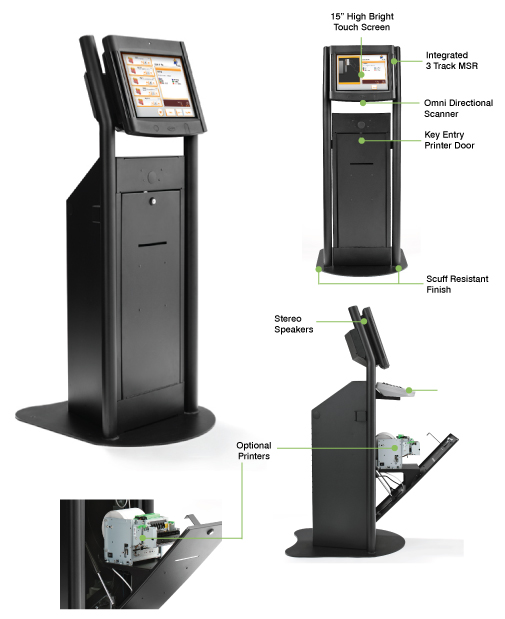 The PAR EverServ® Kiosk 6000 has a sleek design to meet the growing consumer demand for self-service convenience while complementing virtually any environment. The kiosk can be used for a variety of applications including ticketing, self-service point of sale, self-check in as well as informational based applications. EverServ Kiosk 6000 features a new 15” high bright LCD display with proven touch screen technology and printer options including durable fan-fold ticket stock for tickets or thermal receipt printer for receipts.